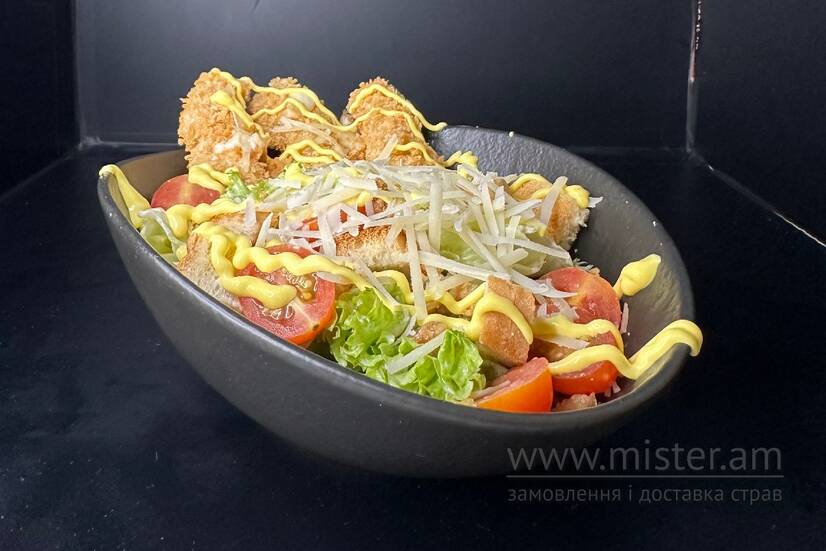 Хрустка курка в паніровці, помідор чері, листсалату, сухарі смажені, сир пармезан, соус цезар, лук фрі