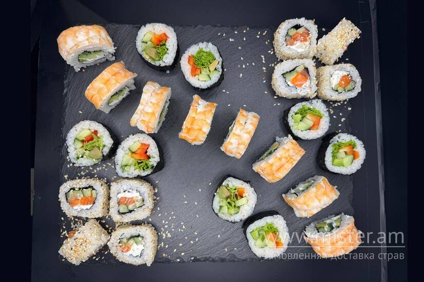 Веган рол, філадельфія з креветкою, філадельфія у кунжуті