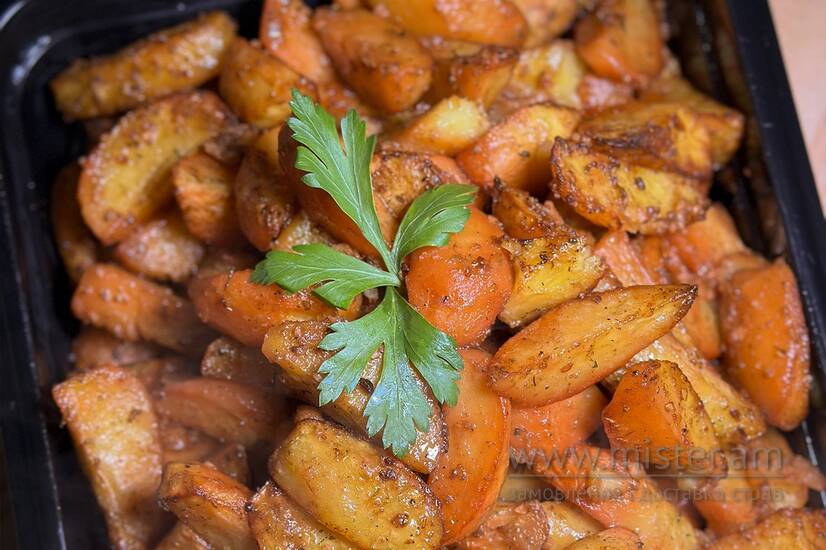 Картопля, перець солодкий свіжий, цибуля ріпчаста, ковбаски мисливські, паприка копчена, куркума вес, олія рослинна, сіль кухонна, перець чорний мелений.