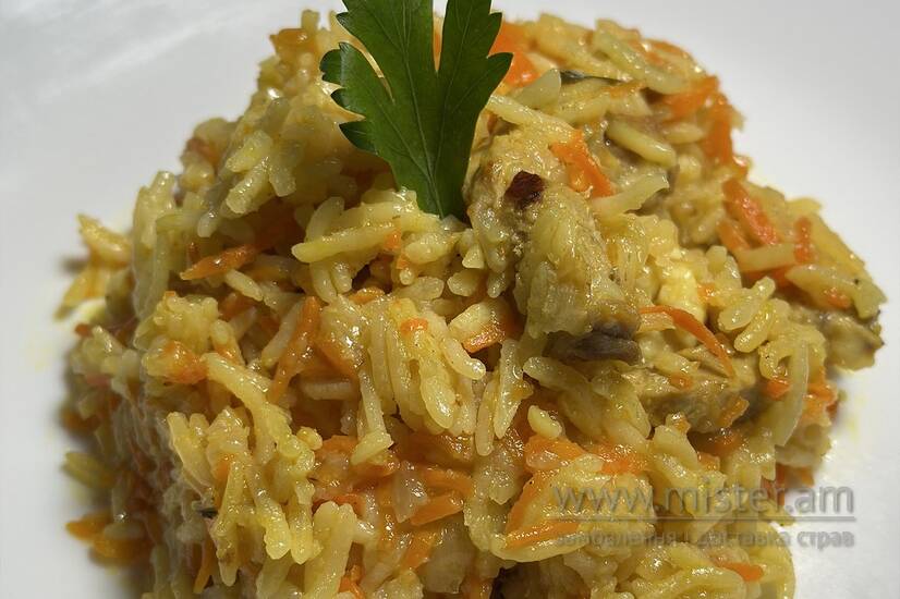 Цибуля ріпчаста, морква свіжа, олія рослинна, приправа до плову, перець чорний мелений, сіль кухонна, рис довгий, задня частина свині.