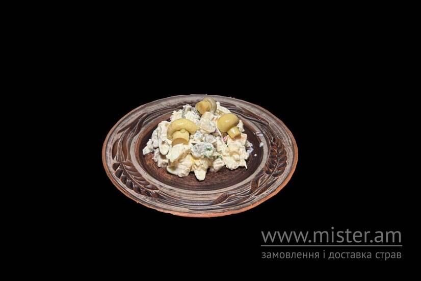 Яйця курячі, печериці мариновані, філе куряче відварене, сир твердий, цибуля, майонез, сіль кухонна.