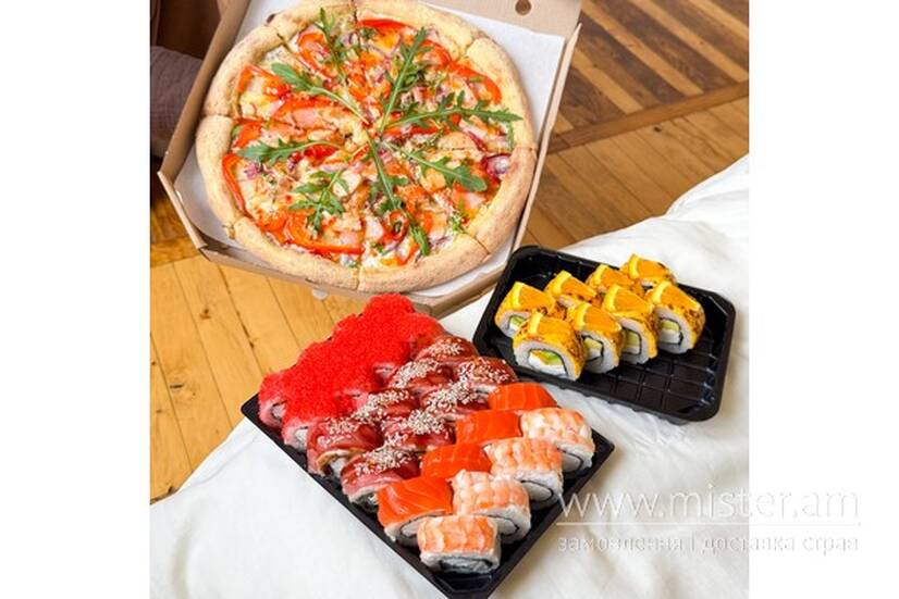 Вікенд: ½ Філадельфія з креветкою і огірком, ½ Філадельфія з лососем і огірком, Філадельфія з тунцем і огірком, Каліфорнія з крабом та огірком, Тропікано з манго та авокадо. Італійська: вершковий соус, моцарела, пармезан, шинка, копчена курка, маринована цибуля, болгарський перець, соус світ чилі, рукола.