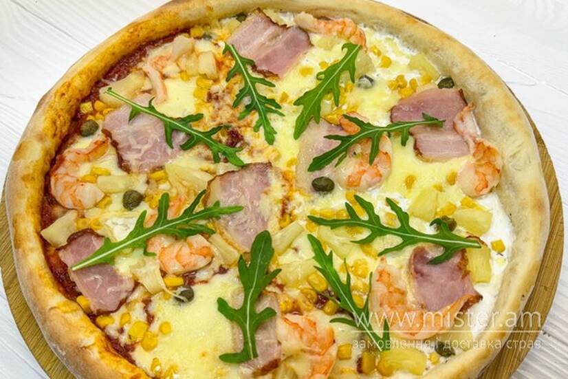 Томатно-вершковий соус, моцарела, бекон, сир брі, креветки, пармезан, голландський сир, ананас, каперси, кукурудза, рукола.