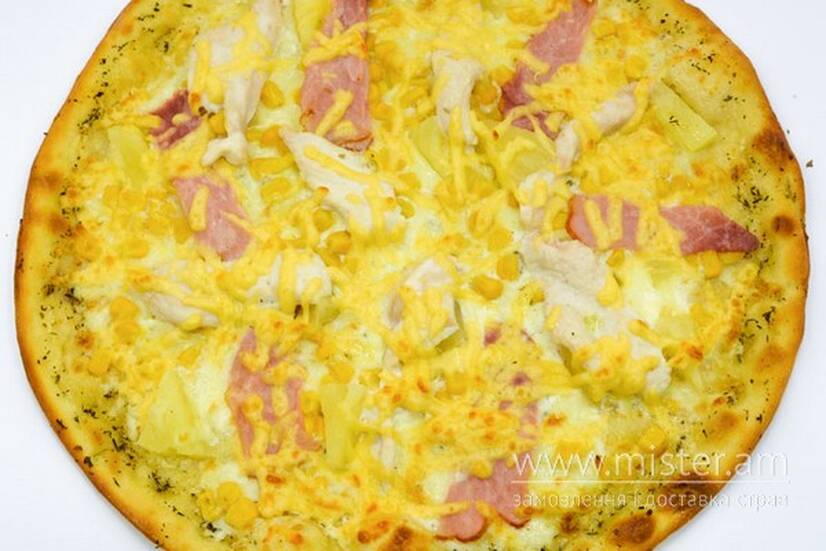 Вершковий соус, куряче філе, шинка, моцарела, ананас, кукурудза.