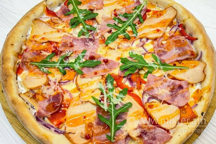 Вершковий соус, моцарела, голландський сир, шинка, копчена курка, маринована цибуля, болгарський перець, соус світ чилі, рукола.