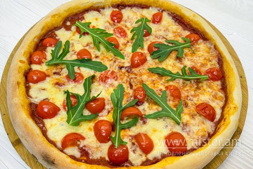 Томатний соус, моцарела, помідор, голландський сир, рукола.