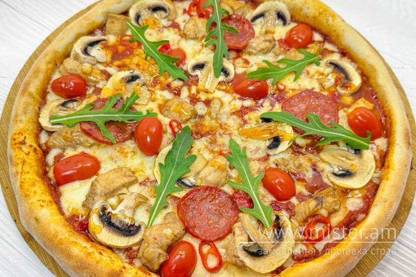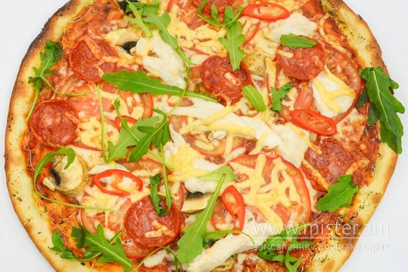 Томатний соус та соус чилі, помідор, куряче філе, печериці, салямі чорізо, голландський сир, перець чилі, рукола.