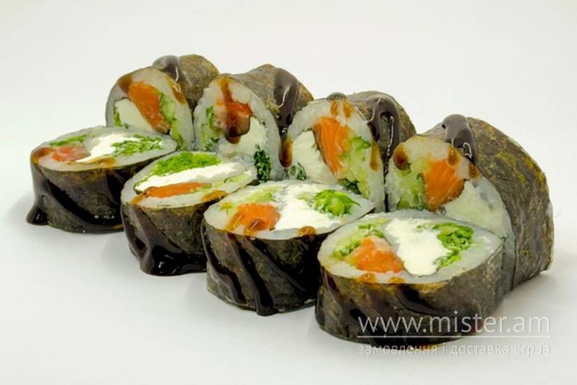 Рис, норі, лосось, сир філадельфія, огірок, пекінська капуста, соус унагі.