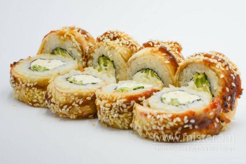 Рис, норі, сир Філадельфія, огірок, вугор, соус унагі, кунжут білий.