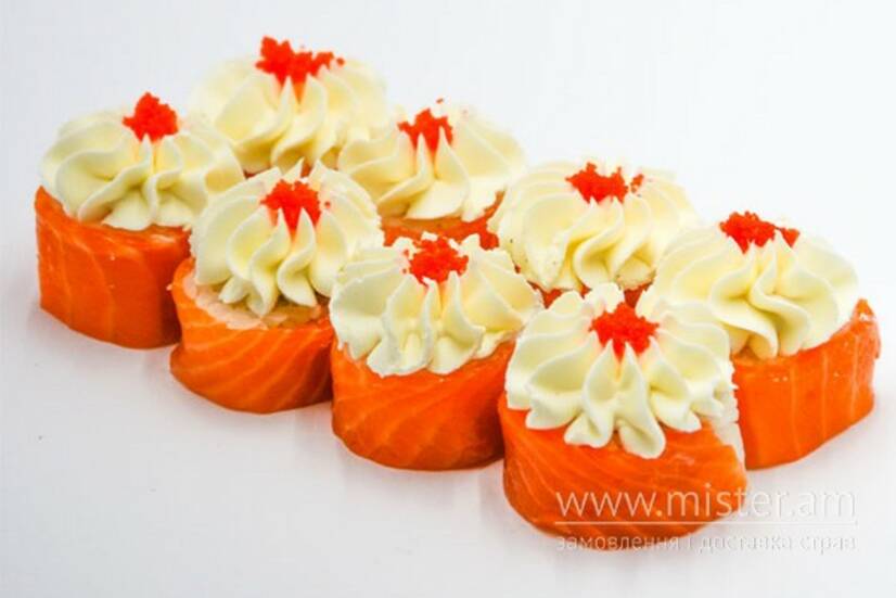 Рис, норі, сир Філадельфія, огірок, креветка, лосось, ікра тобіко.