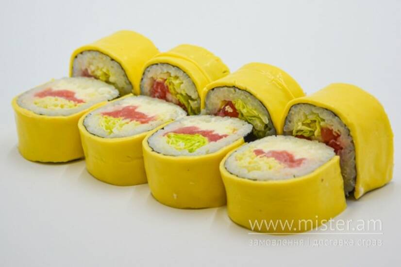 Рис, норі, сир Філадельфія, тунець, пекінська капуста, сир Чеддер.
