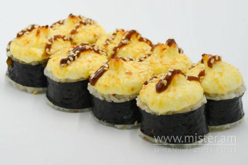 Рис, норі, сирна шапочка, запечений лосось, сир Філадельфія, помідор, соус унагі, кунжут білий.