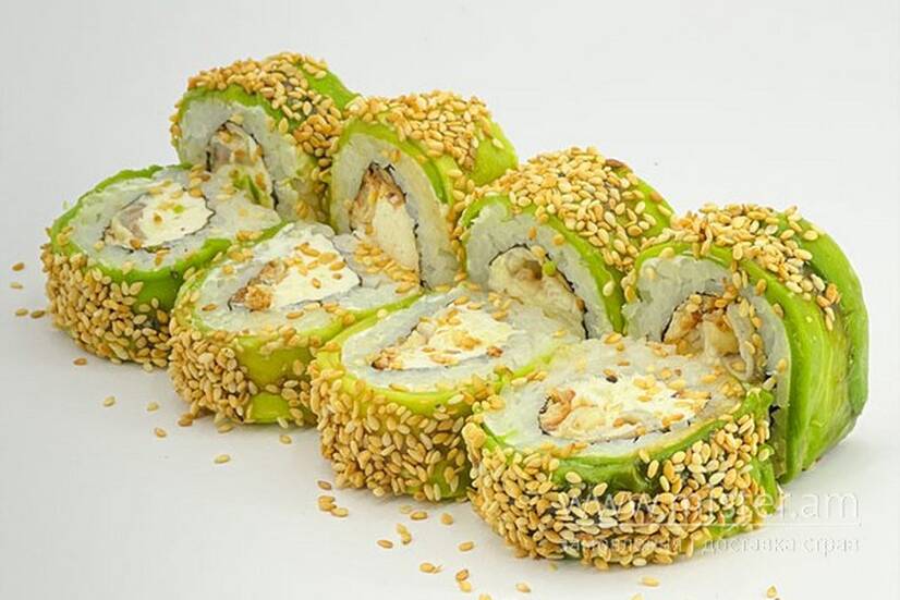Рис, норі, сир Філадельфія, авокадо, вугор, соус унагі, кунжут білий.
