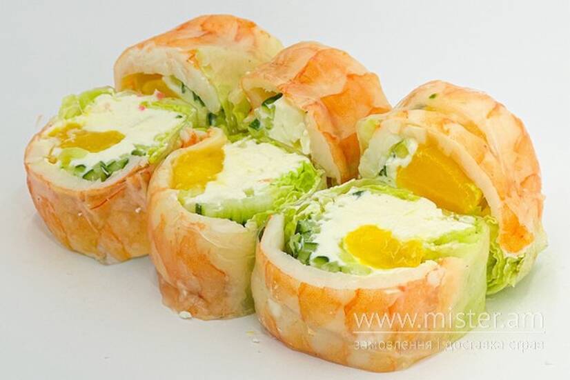 Рисовий папір, креветка, сир Філадельфія, манго, ікра тобіко, лист салату.