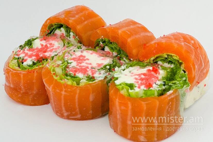 Рисовий папір, лосось, сир Філадельфія, огірок, ікра тобіко, лист салату.