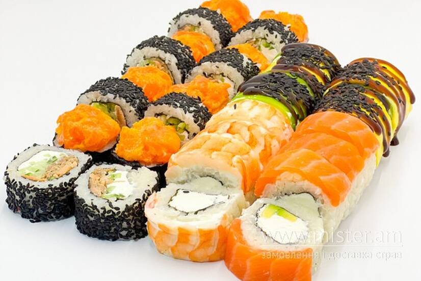 ½ Філадельфія з авокадо, ½ Філадельфія з креветкою, лосось світ чилі, Танарі із запеченим лососем, ½ авокадо рол з куркою, ½ чізрол з куркою.