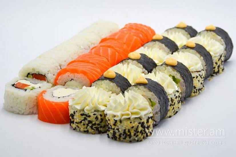 Філадельфія класична, Аляска з лососем, Каліфорнія кунжут, футомак окі.