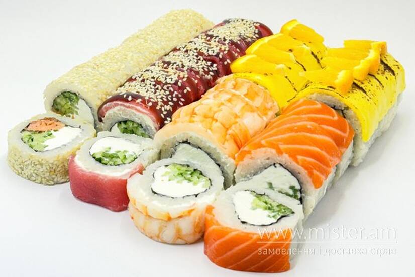 ½ Філадельфія з лососем, ½ Філадельфія з креветкою, Філадельфія з тунцем, обаке з запеченим лососем, Тропікано з манго та авокадо.