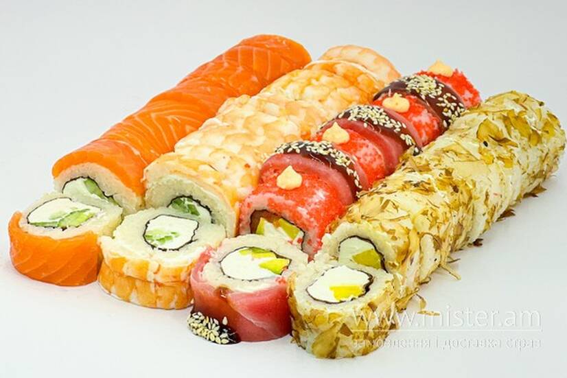 Філадельфія з огірком, Філадельфія з креветкою, ½ Філадельфія з тунцем, ½ рол з ікрою масаго і свіжим тунцем, боніто з манго.