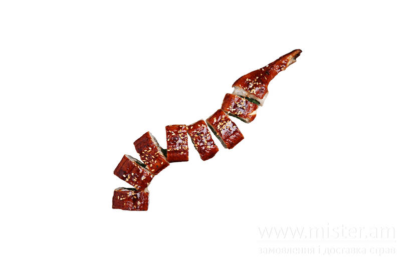 Вугор, огірок, чука, сир Філадельфія, соус унагі, кунжут.
