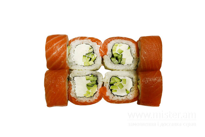 Багато лосося, сир Філадельфія, огірок, авокадо.