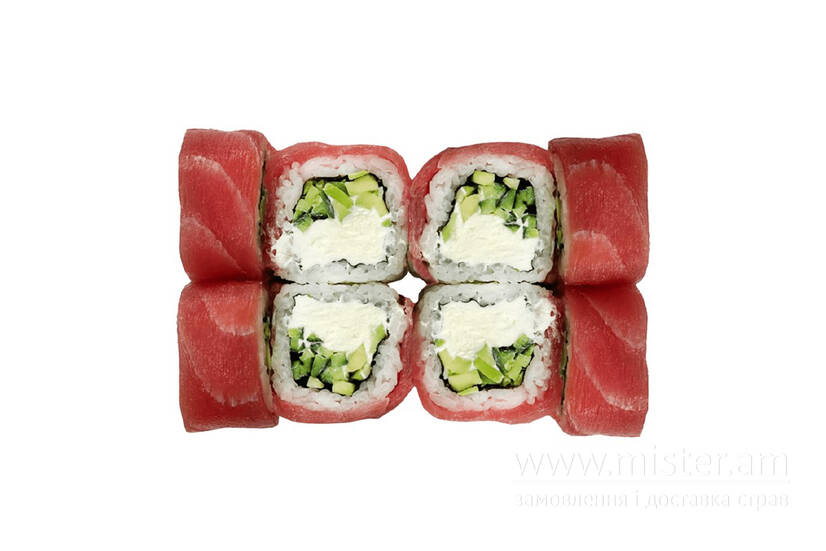 Багато тунця, сир Філадельфія, огірок, авокадо.