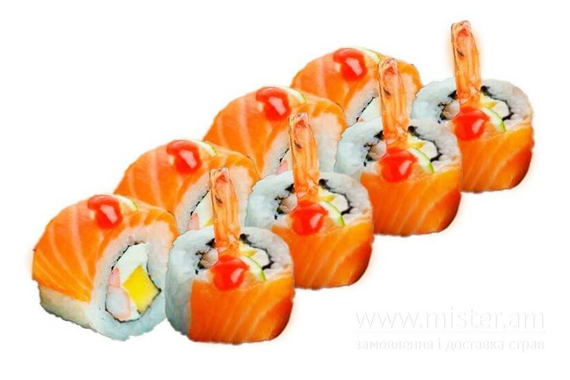 Рис, норі, лосось, креветка, манго, сир вершковий, соус спайсі.