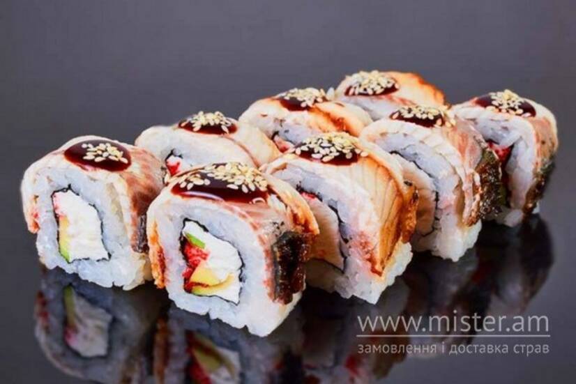 Вугор, крем-сир, огірок, авокадо, кунжут, соус Унагі.