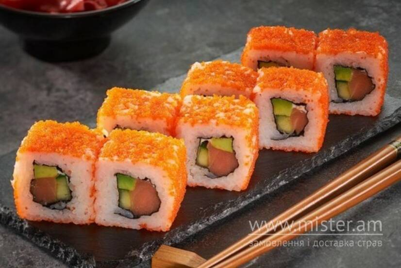 Лосось, огірок, ікра летючої риби, японський майонез.