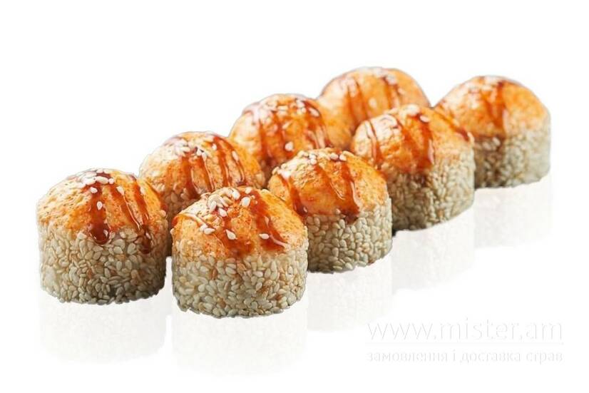 Рис, мідії, сир вершковий, омлет Томаго, кунжут, рис, соус майо, тобіко, унагі соус.