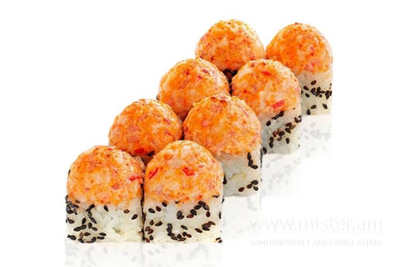 Рис, креветка, мідії, вершковий сир, чорний кунжут, спайсі соус.