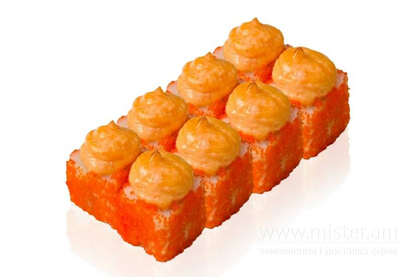 Рис, креветка, крабовий салат, огірок, рис, Масаго, соус спайсі.