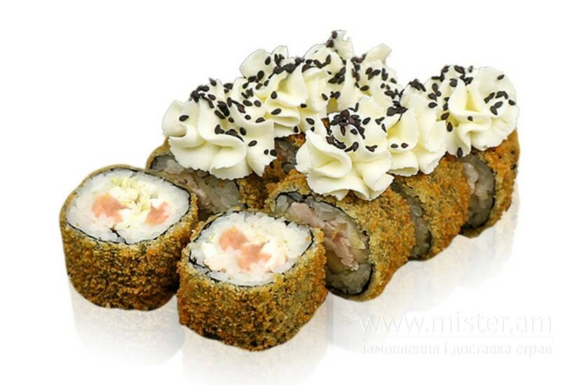 Рис, лосось, сир вершковий, салат Айсберг, кунжут, темпура, сухарі Панко.