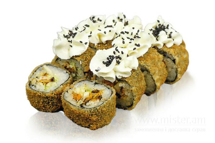 Рис, мідії, сир вершковий, салат Айсберг, кунжут, темпура, сухарі Панко.