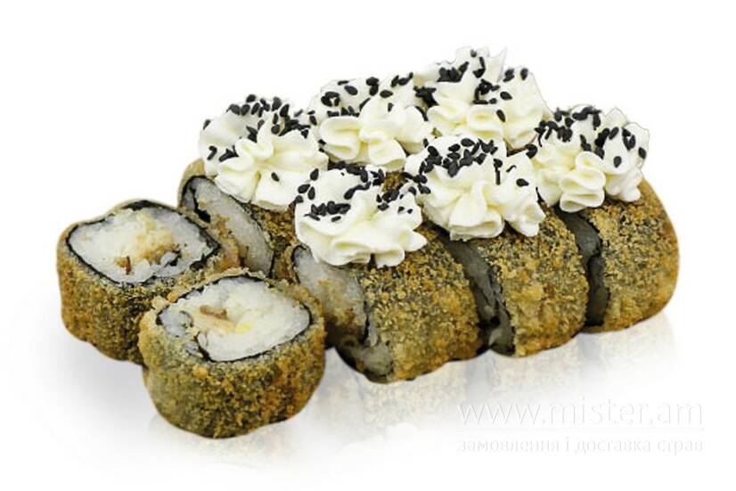 Рис, вугор, сир вершковий, салат Айсберг, кунжут, темпура, сухарі Панко.