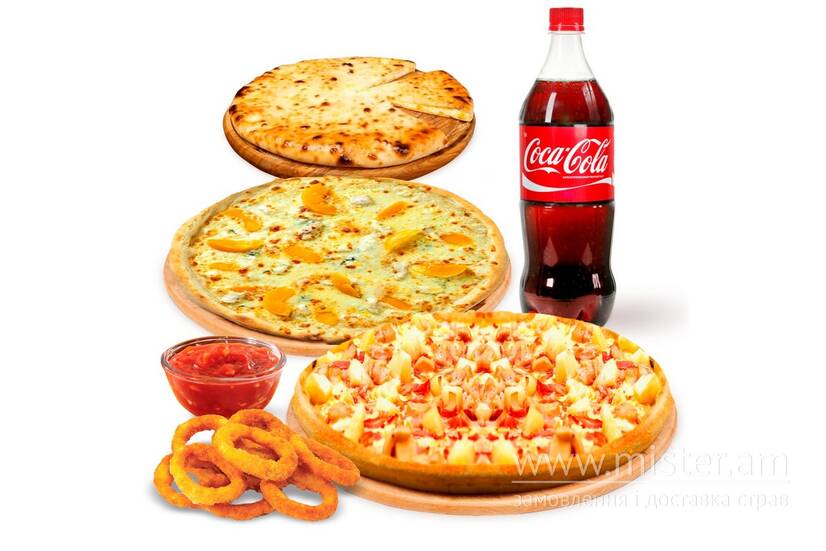 Піца "Гавайська", піца "Світ чікен", піца "Дольче з манго", цибулеві кільця, соус манго-чилі, кола 0,7 л.