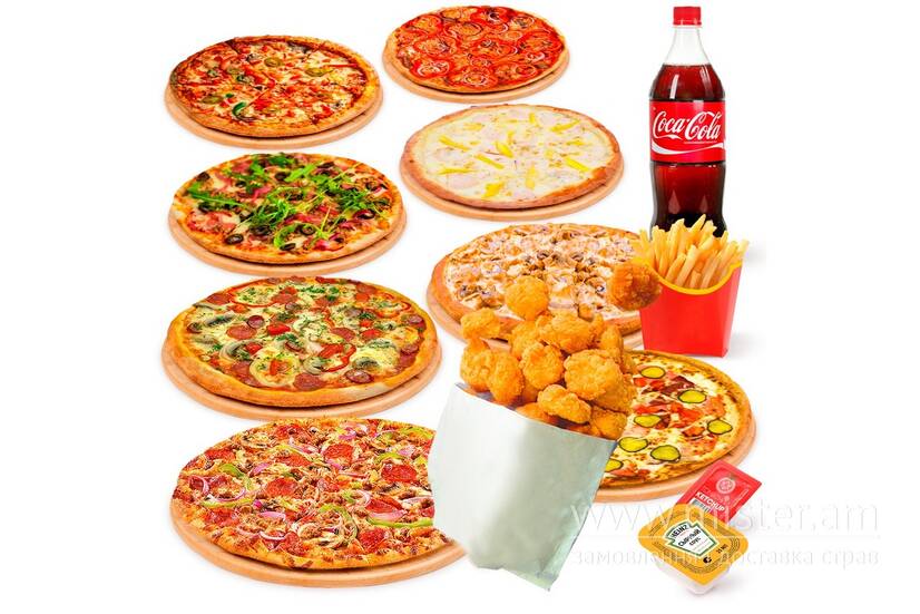 Піца "Тоні пеппероні", піца "Супер чізбургер", піца "Арізона", піца "Чікен пармеджано", піца "Чікен хіт", піца по Сіцилійськи, піца "Мексиканська", піца "Верона", картопля фрі велика, нагетси велика, соус кетчуп, соус сирний, кола 0,7 л.