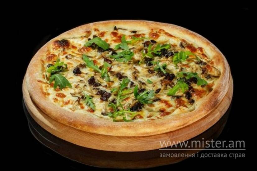 Моцарелла, соус Альфредо, бекон, гриб, рукола.