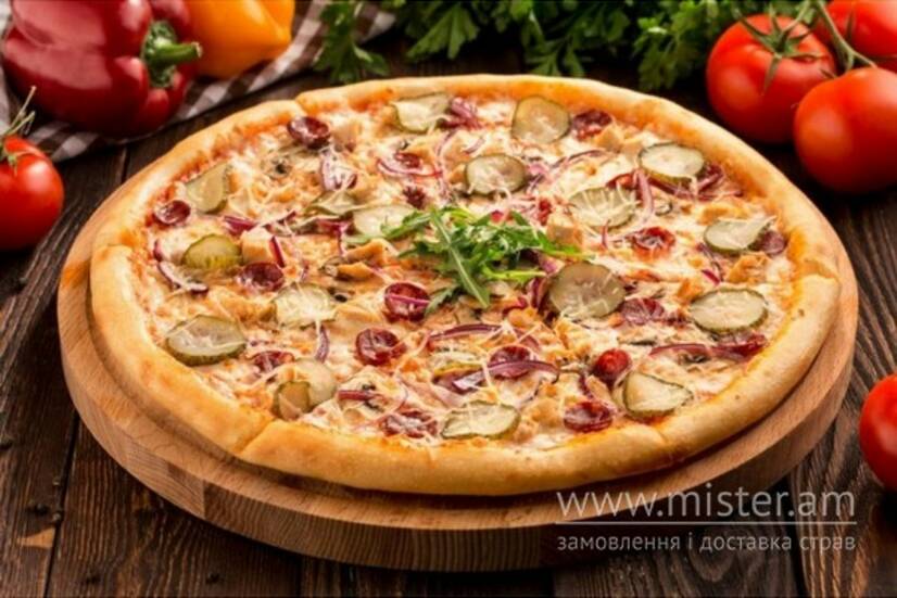 Моцарелла, червоний соус, мисливські ковбаски, курка, помідор, гриб, корнішони.