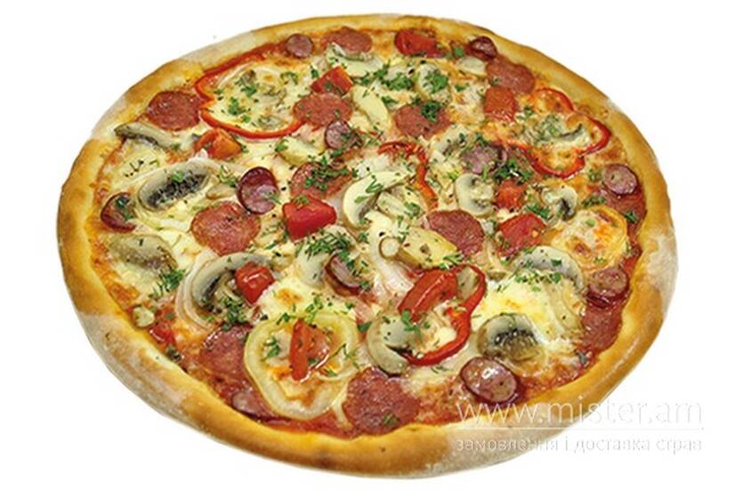 Сир Моцарелла, соус з томатами Пілаті, соус Альфредо, печериці, мисливські ковбаски, ковбаса салямі, бекон, червона цибуля, корнішони, помідори чері.