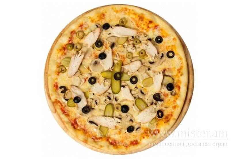 Сир Моцарелла, Чільєджіні, шинка, печериці, корнішони, соус з томатами пілаті, маслини, оливки, орегано.