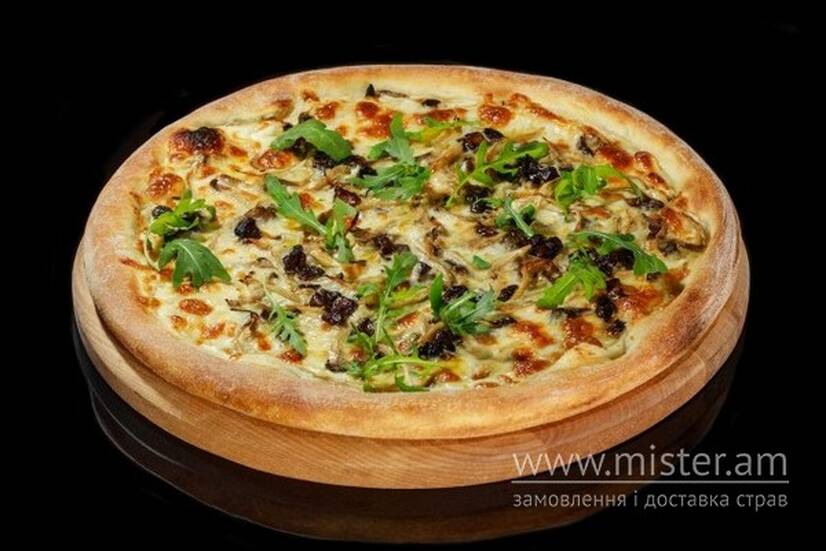 Моцарелла, соус Альфредо, бекон, гриб, рукола.