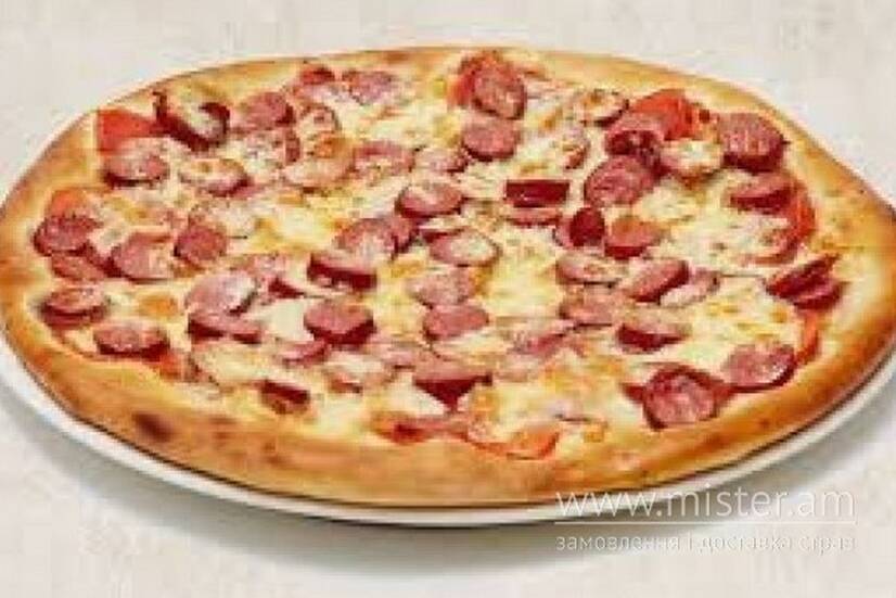 Моцарелла, соус томатний, ковбаски мисливські, бекон, салямі, помідори, цибуля, гриби печериці, білі гриби, лисички.