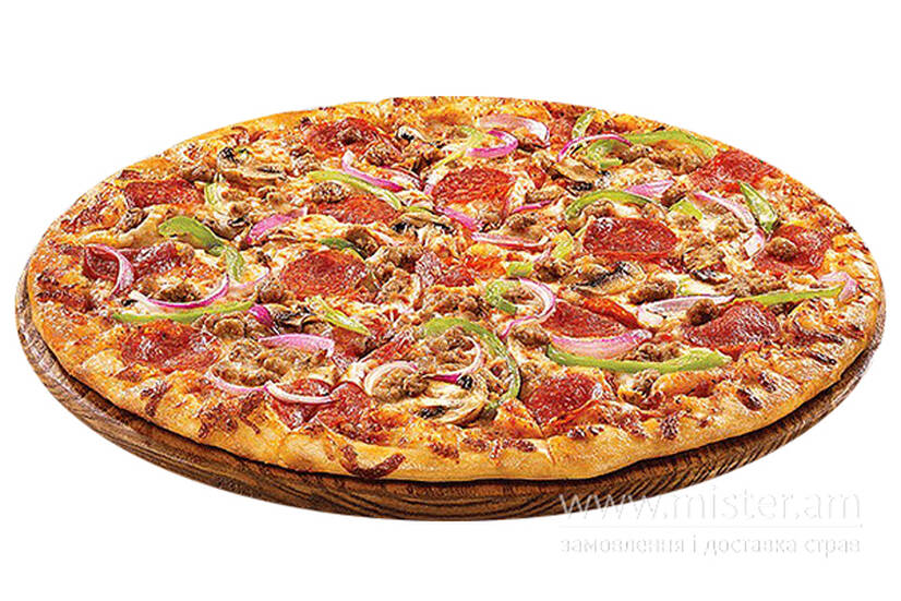 Шинка, пепероні, яловичина, печериці, солодкий болгарський перець, сир Моцарелла, червоний соус з томатами Пілаті, червона цибуля, маслини, оливки, прованські трави.