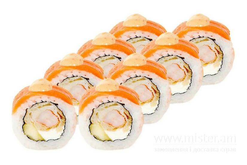 Рис, норі, копчений лосось, креветка в темпурі, манго, вершковий сир, спайсі.