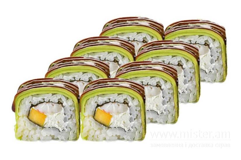 Рис, норі, вершковий сир, авокадо, креветка, манго.
