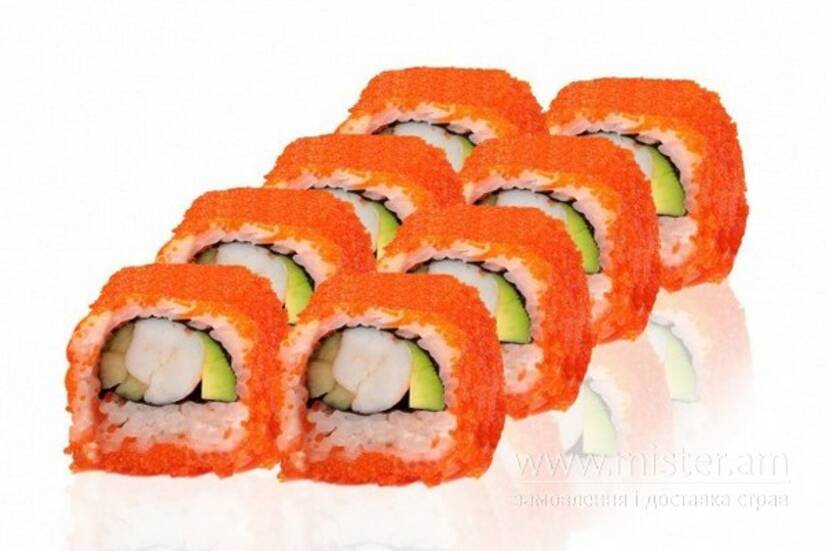 Креветка в темпурі, рис, огірок, ікра летючої риби.