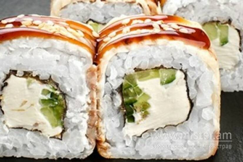 Рис, норі, креветка, вугор, огірок, авокадо, крем-сир. кунжут, соус Унагі.