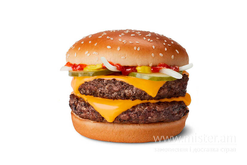 Беремо велику булочку, смажимо дві котлети, соус сирний, соус авторський, сир моцарела, сир чедер, карамелізовану цибулю, трохи маринованих огірочків, для пікантності пару скибок гостренького халапеньйо.