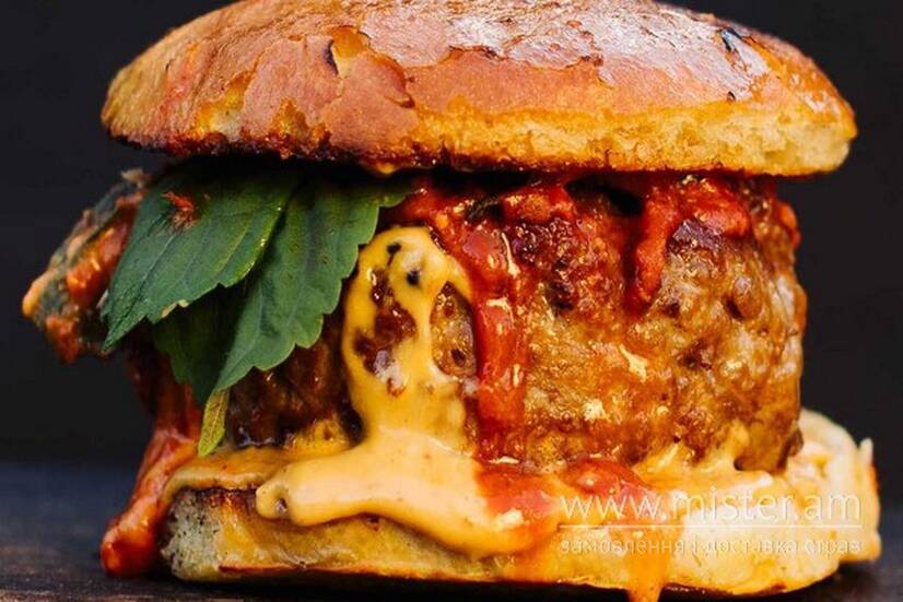 Беремо велику булочку, смажимо котлету, додаємо сир чедер, гостру корейську капусту кімчі, зелену цибулю, авторський соус.